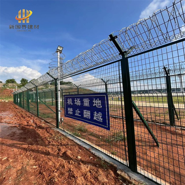 機場鋼筋網圍界一般由鋼筋焊接網、Y型防護立柱以及蛇腹式刀刺網等幾大主體組成,既有良好的通透性,又能起到強有力的安全隔離防護效果,同時美觀大方,與周圍環境以及任何景觀、設備都能完美相融合,因此機場鋼筋網圍界常被大量應用于機場隔離,監獄防護、軍事基地圈護等特殊地帶的安全防護。