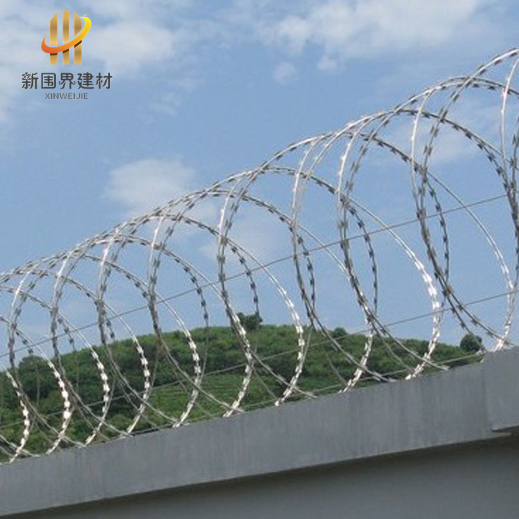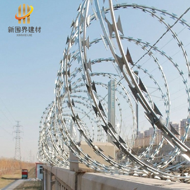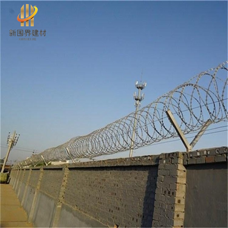 圍墻防爬網(wǎng)、磚墻加裝防盜網(wǎng),一般采用刀片刺繩隔離網(wǎng),這是一種防護(hù)、隔離能力較強(qiáng)的防護(hù)產(chǎn)品,采用優(yōu)質(zhì)鋼片沖壓尖刺包裹高強(qiáng)度鋼絲壓制而成,雙線用卡扣銜接固定,呈現(xiàn)螺旋型,既美觀又讓人不寒而栗。