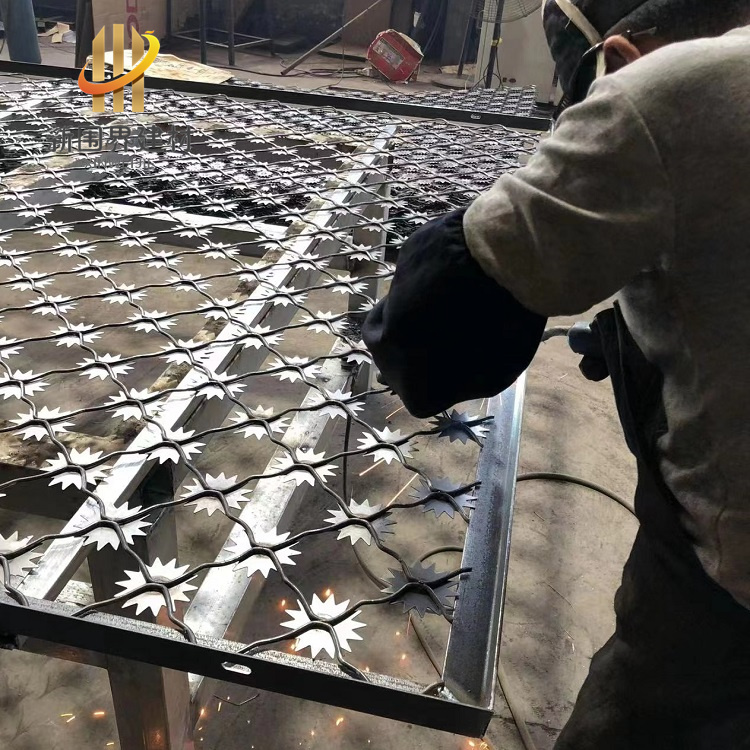 梅花刺網特點 :是用氬弧焊將梅花形刺片焊接在美格網的節點上,形成刺形保護,防止了手握腳攀。具有防攀爬、抗剪切、高安全防護性能。還具有美觀、實用、防阻效果好、施工便利等優點。
