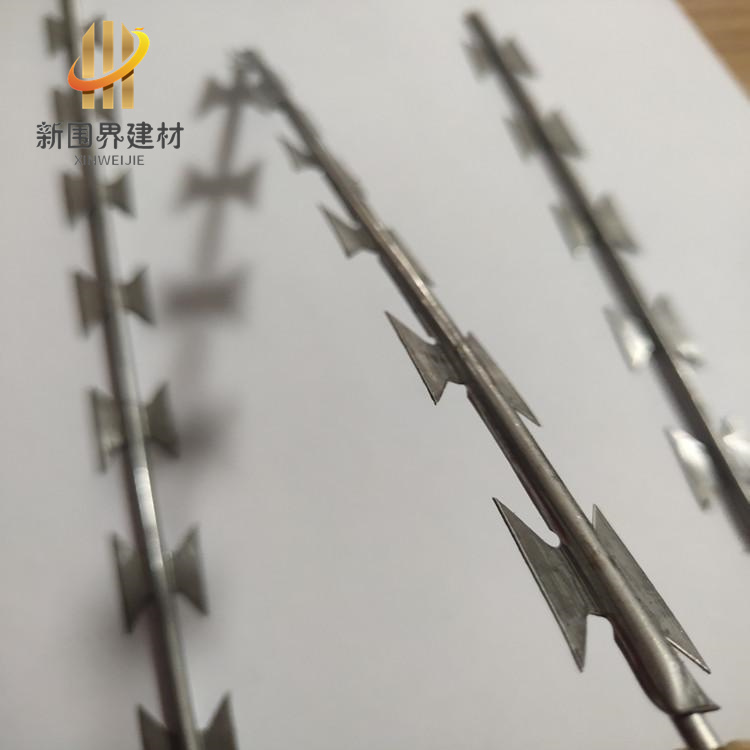 產品特點:直線型刀片刺網類似于鐵絲刺繩成直條狀,刺的位置為刀片狀,經校直后根據立柱間距一般為三米左右長一根,其長度可以根據客戶的要求進行定制,在安裝完成后構建成一道防護墻,具有美觀防護的作用,深受學校圍墻、工廠公園圍墻、監獄、看守所、機關單位等場所來使用。