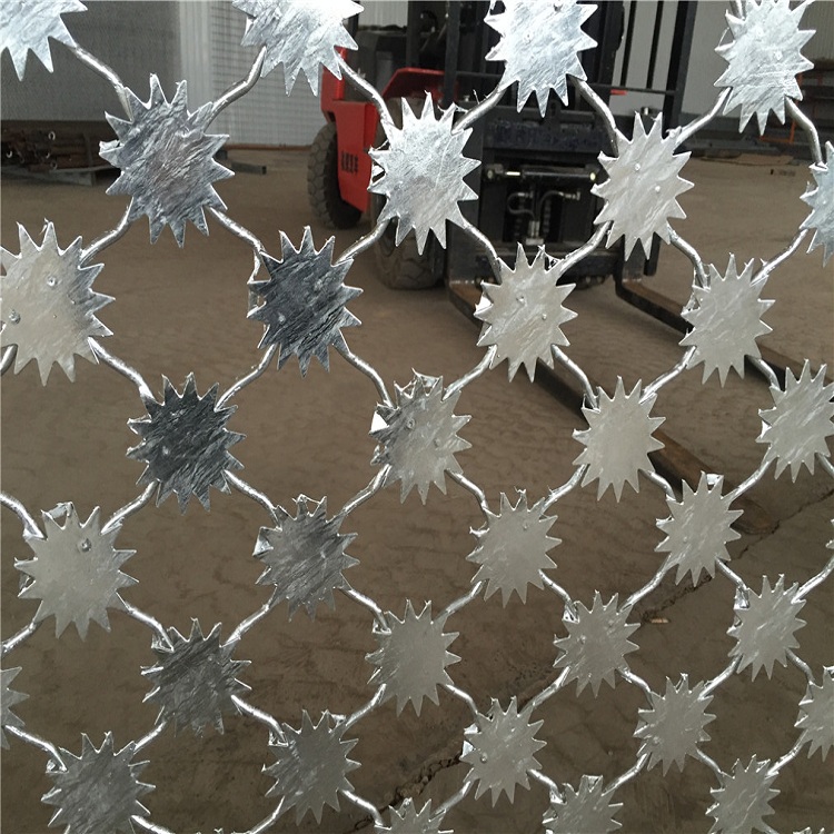 梅花刺片隔離網(wǎng)材質(zhì):一般為不銹鋼材料,也有的采用熱鍍鋅、后熱鍍鋅或者浸塑防腐處理。