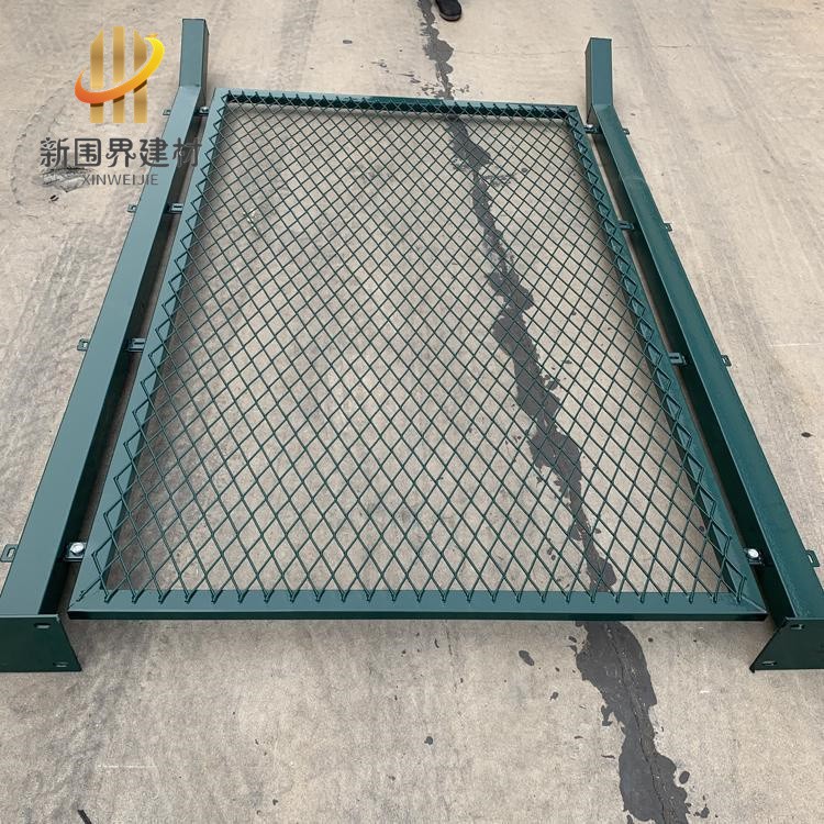 網片一般為菱形孔鋼板網或正孔斜方網片,網孔50*50mm,網絲5mm;邊框一般為48mm圓管或38mm圓管;立柱為75mm圓管;表面處理為浸塑,塑層厚度不低于0.5mm,顏色一般為墨綠色或草綠色或者白色。