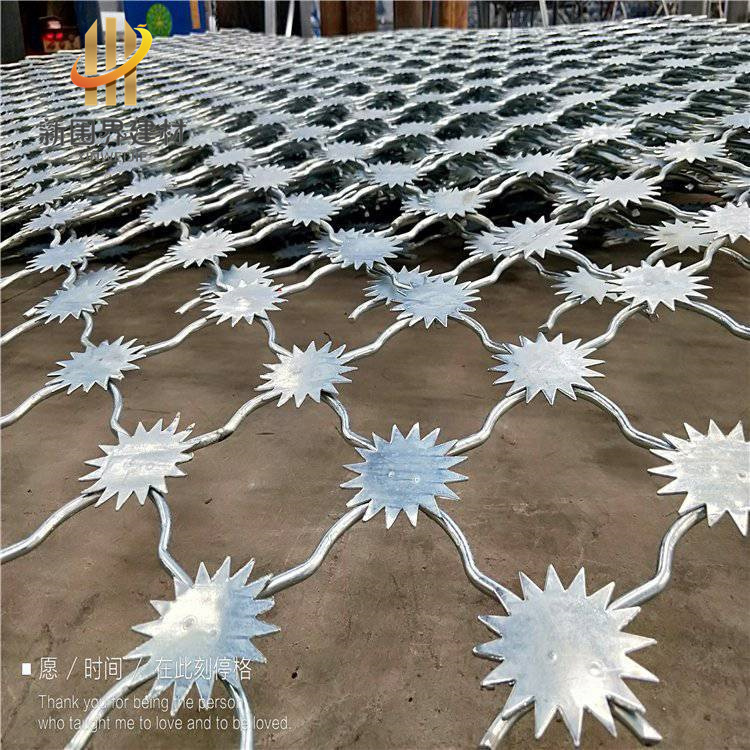 主要采用鋼板沖壓或者激光切割成的刺片,用氬弧焊將刺片焊接在美格網的節點上,形成了刺形保護,有效的防止了手握腳攀。材質一般為不銹鋼材質,也有采用熱鍍鋅或者厚熱鍍鋅或者浸塑防腐處理。