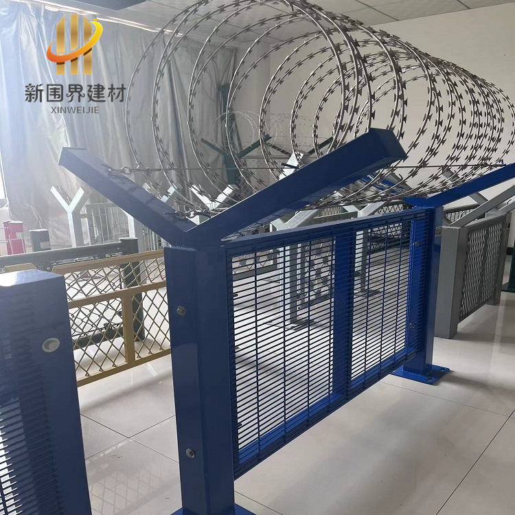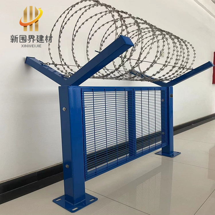 Y型立柱安全防御護網的立柱上端是由V型的支架焊接網片,整體看來其立柱相似Y型,故名為Y型安全防御護網。安全防盜連接件和熱鍍鋅刀片刺網組成強度和安全防御性級別很高。被廣泛應用在飛機場、監獄監墻、看守所、戒毒所、哨所、部隊、軍事管理區、國界、邊境線、基地等高安全場所。