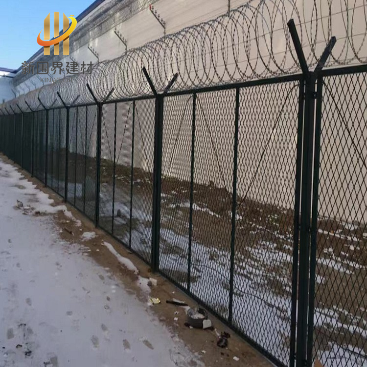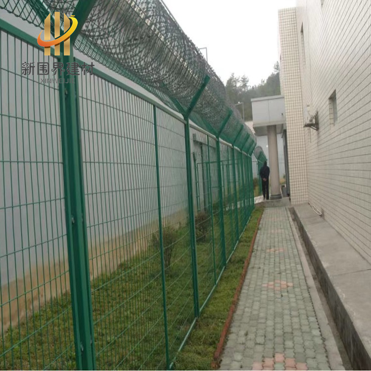 看守所鋼絲網(wǎng)圍墻是一種防翻越、防破壞性能較強(qiáng)的防護(hù)網(wǎng),主體一般由網(wǎng)片、立柱和蛇腹式刀刺網(wǎng)三大部分組成。網(wǎng)片四周焊接邊框,以增加隔離網(wǎng)墻的防護(hù)強(qiáng)度,看守所鋼絲網(wǎng)圍墻的邊框和其他場地的邊框不同,網(wǎng)片中間需要加豎撐,可以起到豎向支撐網(wǎng)片的作用,邊框左右兩側(cè)焊接連接邊耳,以便于和兩側(cè)的立柱連接。立柱的頂部焊接V型彎頭,這種立柱也叫做Y型立柱,也可以加裝V型網(wǎng)片,用來架設(shè)蛇腹型刀片刺繩,這樣就和下邊的網(wǎng)片完美結(jié)合,形成一道難以逾越的銅墻鐵壁。表面處理一般采用熱鍍鋅材料,表面再浸塑,常見為綠色。