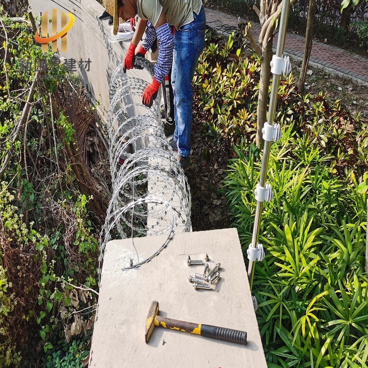 采用鋼板(刀板)沖壓成型包附于熱鍍鋅鋼絲(芯線)之上,由銳利尖角鍍鋅鋼板或不銹鋼薄板做刀片,高張力鋼絲做芯線組合而成的。刀片刺網具有美觀、經濟實用、防阻效果好、施工便利、應用廣泛等優異特點。
