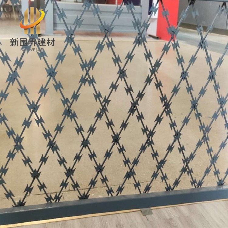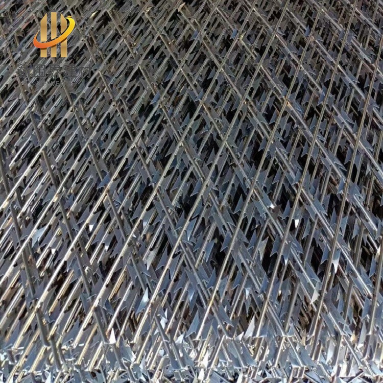 菱形刀片刺網是一種常見的防護設施,廣泛應用于圍墻、圍欄、安全門等場所。它的特點是造型獨特,刺尖鋒利,能夠有效地阻止人員的非法入侵,起到一定的防護作用。刀片刺網的造型獨特,具有一定的威懾作用,可以有效地嚇阻潛在的入侵者。