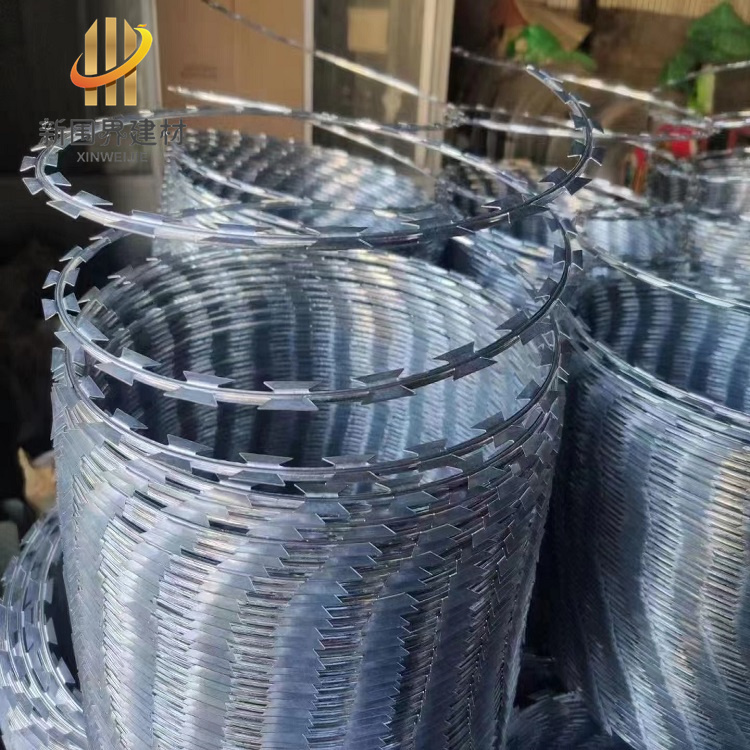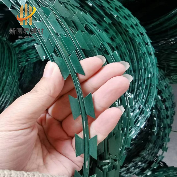 它采用鋼板沖壓成型包附于熱鍍鋅鋼絲(筋絲)之上,由銳利尖角鍍鋅鋼板或不銹鋼薄板做刀片,高張力鋼絲做芯線組合而成的。