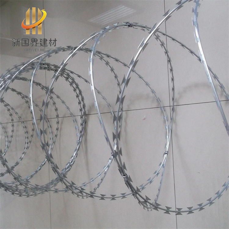 采用鋼板(刀板)沖壓成型包附于熱鍍鋅鋼絲(芯線)之上,由銳利尖角鍍鋅鋼板或不銹鋼薄板做刀片,高張力鋼絲做芯線組合而成的。BTO-22為國內最常用型號(其它型號也可以訂做)。