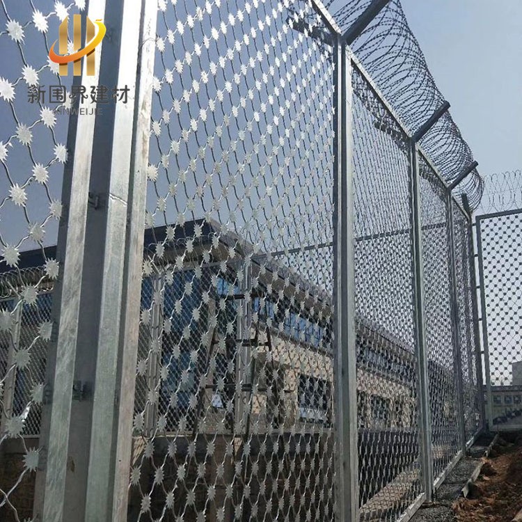 梅花刺隔離網(wǎng)又叫沖壓刺隔離網(wǎng)、太陽花刺片隔離網(wǎng),行業(yè)內(nèi)簡(jiǎn)稱梅花刺網(wǎng)。其特點(diǎn)為堅(jiān)固牢靠、防止攀爬等。梅花刺隔離網(wǎng)一般用于監(jiān)獄大門、探監(jiān)門、人員通道兩邊的隔離網(wǎng),由于其成本造價(jià)高,所以還沒有廣泛替代焊接式隔離網(wǎng)。整體架構(gòu)由美格網(wǎng)+梅花刺片、邊框、立柱、刀刺網(wǎng)組成。