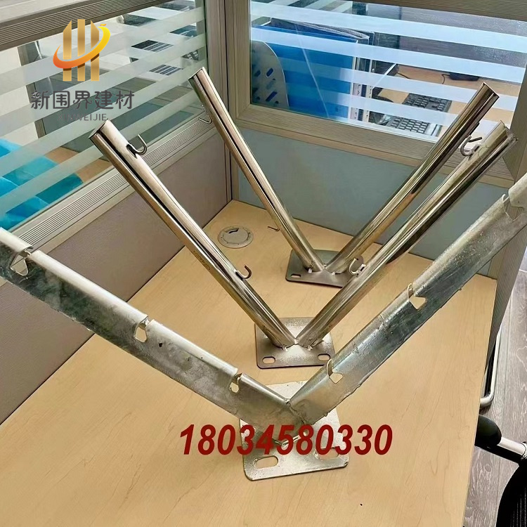 雙曲臂V型支架主要用于圍墻上架設(shè)刀片刺繩,一般材質(zhì)分為:304不銹鋼、201不銹鋼、厚熱鍍鋅沖壓、熱鍍鋅焊接角鐵支架等。