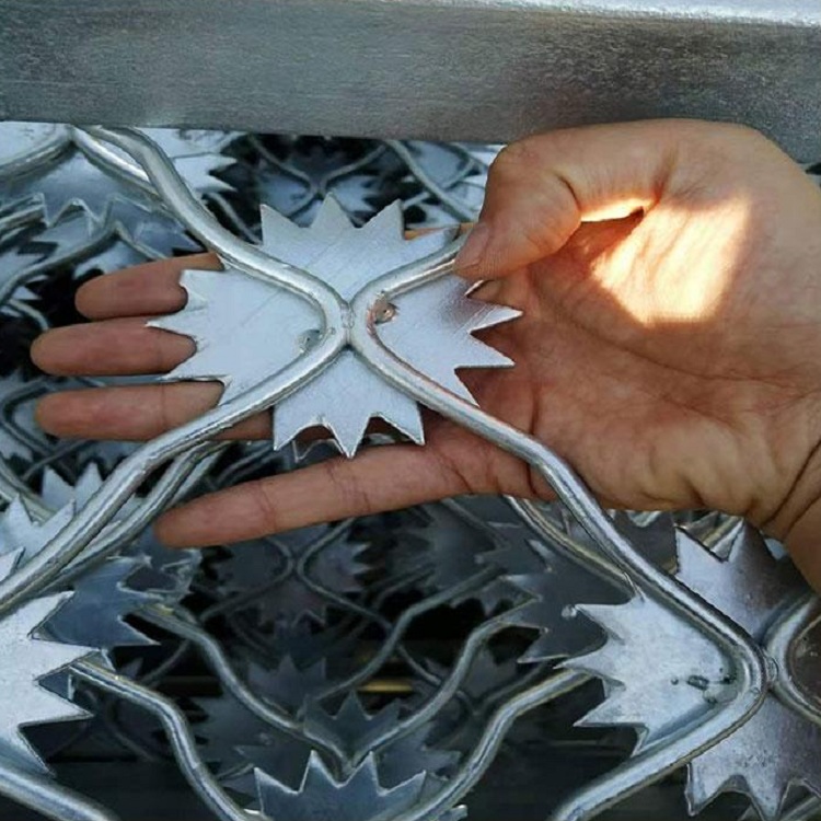 監(jiān)獄防攀爬帶刺片金屬鋼網(wǎng)墻又稱監(jiān)獄太陽花刺網(wǎng)、監(jiān)獄鍍鋅梅花刺片隔離網(wǎng)、高安全防護(hù)網(wǎng)、防護(hù)網(wǎng),是用氬弧焊將梅花形刺片焊接在美格網(wǎng)的節(jié)點上,形成刺形保護(hù),防止了手握腳攀,為此該網(wǎng)開始在監(jiān)獄等高安全隔離場所使用。
