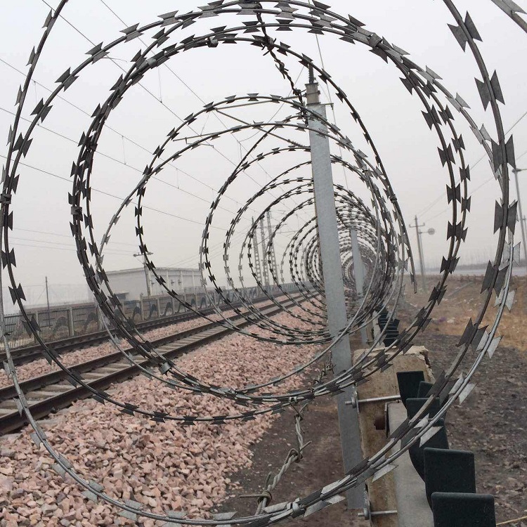 圍墻刺絲滾籠,也叫防攀爬刺刀圈,刀片刺繩,常見的是蛇腹形(螺旋式)刺絲滾籠。