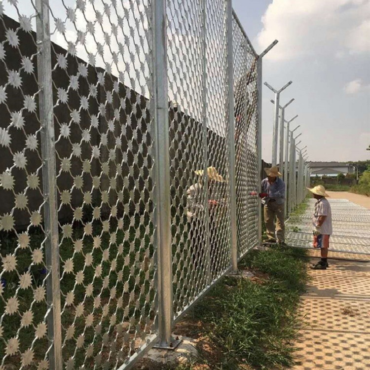 整體架構由美格網+梅花刺片、邊框、立柱、刀刺網,表面防腐處理常做成熱浸鋅的,配圓柱居多。