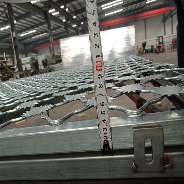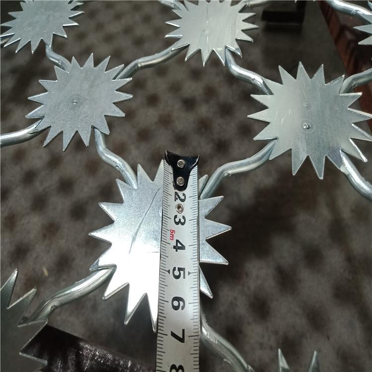 監獄梅花刺隔離網又叫沖壓刺隔離網、太陽花刺片隔離網,行業內簡稱梅花刺網。其特點為堅固牢靠、防止攀爬等。梅花刺隔離網一般用于監獄大門,探監門,人員通道兩邊的隔離網,由于其成本造價高,所以還沒有廣泛替代焊接式隔離網。