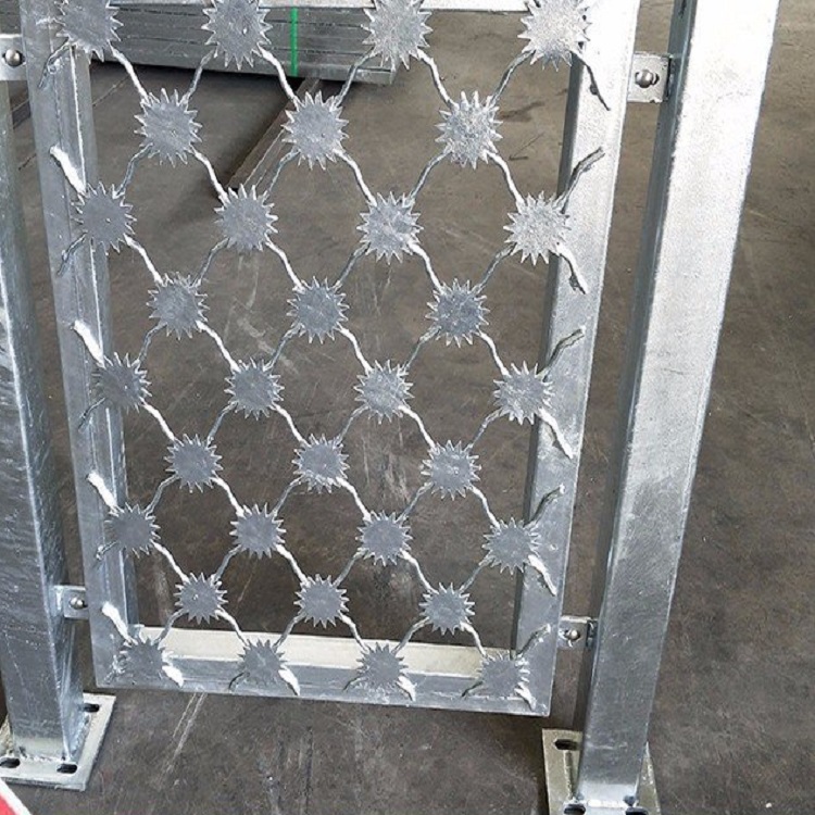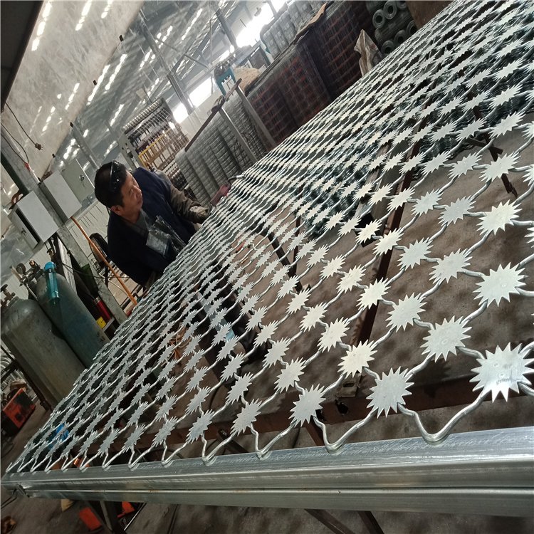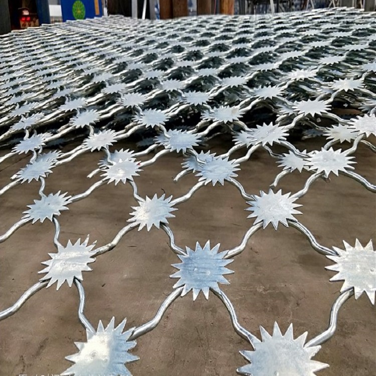 1、梅花刺片:梅花刺片直徑不小于7.5cm(直徑6cm、7cm、8cm),刺片厚1.5mm,采用Q235低碳鋼板沖壓成型。梅花刺片用氬弧焊將梅花形刺片焊接在美格網的節點上,形成刺形保護,有效的防止了手握腳攀。