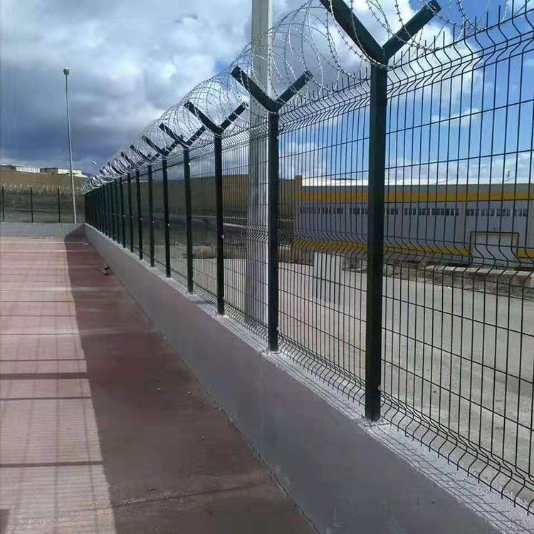 絲徑:4mm-6mm,網孔:50*100mm高度:1.8-3m寬度:2-3m頂部加防爬刺滾網,另外一種焊接的防護隔離圍界是用刀片刺網直條焊接而成的,網孔一般為:75*150mm,高度和寬度(同上),這種用刀片直條焊接的機場防護圍界,具有更好的防攀爬防隔離效果。