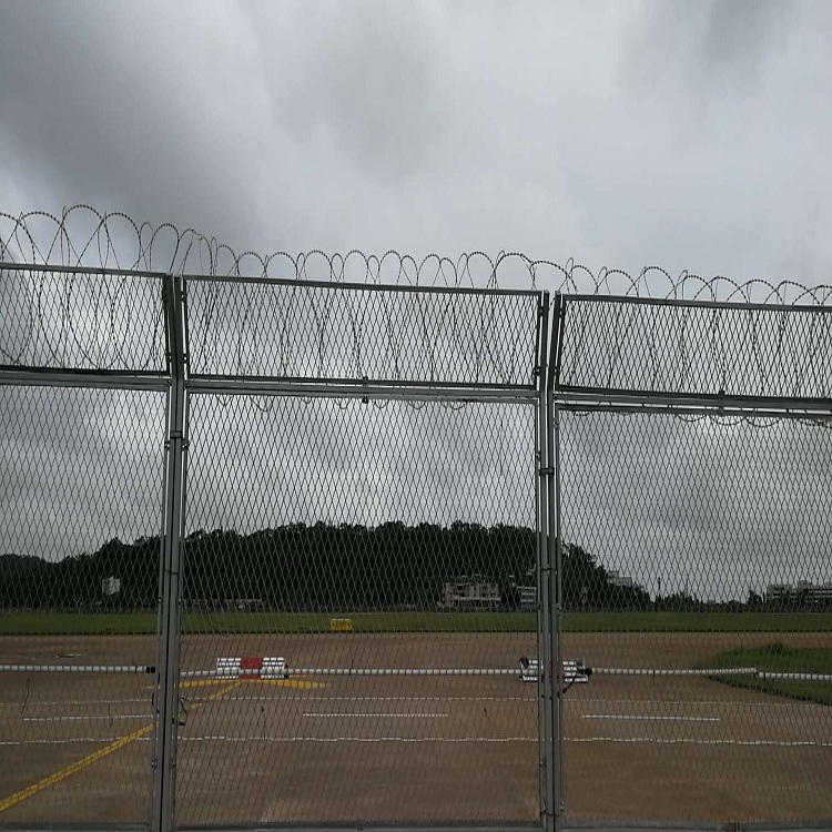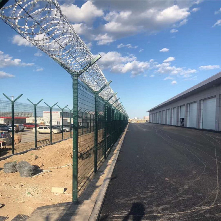 機場圍界網又稱作“Y型安全防御護網”,是由V型支架立柱,加強型焊接片網,安全防盜連接件和熱鍍鋅刀片刺籠組成強度和安全防御性級別很高。近年來,被廣泛應用在機場,軍事基地等高安全場所。目前,大部分在機場圍界網頂部加裝刀片刺絲、刀片刺繩后又很好的增強了安全防護性能,所以又叫作“刀刺護欄網”。