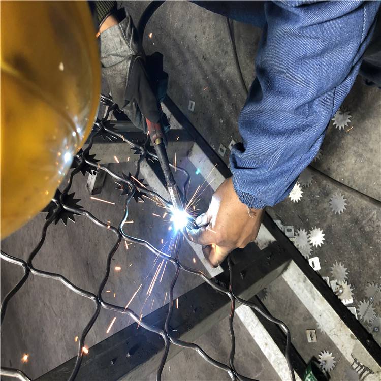 是用氬弧焊將梅花形刺片焊接在美格網(wǎng)的節(jié)點上,形成刺形保護,有效的防止了手握腳攀,為此該網(wǎng)開始在監(jiān)獄或看守所使用。材質(zhì)一般為不銹鋼材料,也有的采用熱鍍鋅、后熱鍍鋅或者浸塑防腐處理。