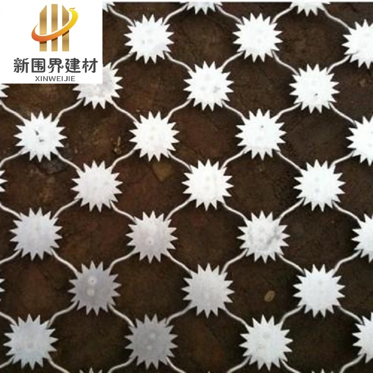 梅花刺網@梅花刺片防逃網@梅花刺片防護網,網片為菱形網孔,每一個焊點附焊梅花刺一個,形成刺形保護,有效的防止了手握腳攀,達到嚇阻、隔離的作用。