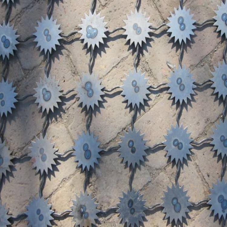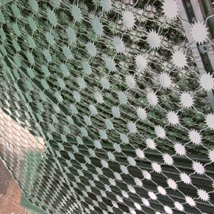 主要是采用高強度的刀片刺網與普通防護網的結合,由V型支架立拄,型焊接片網,安全防盜連接件和刀片刺網組成.刀片刺網是一種防護網,由銳利尖角鍍鋅鋼板或不銹鋼薄板做刀片,鋼絲做芯線組合而成的防護器材梅花刺網又稱高安全防護網、防護網,是用氬弧焊將梅花形刺片焊接在美格網的節點上,形成刺形保護,防止了手握腳攀,為此該網開始在或使用。