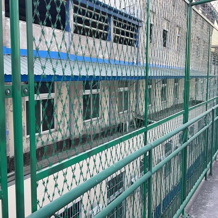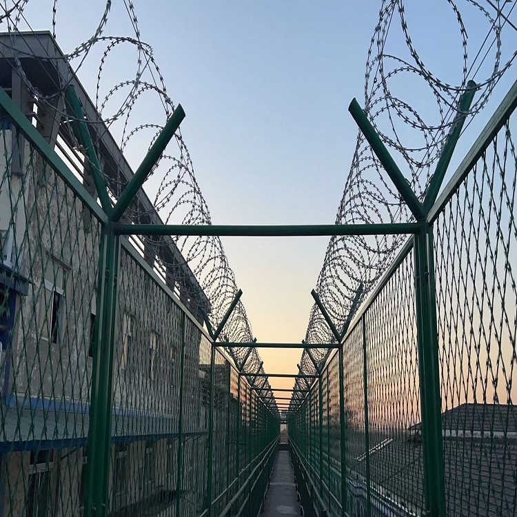 是非常重要的監區安全防護設施,是由焊接鋼網加蛇腹形刀刺網組合而成。產品具有結構新穎、堅固緊密、網面平整、網孔均勻、刀鋒銳利、防攀爬、防腐蝕性強等特點。建于看守所監區的內外墻地面及高墻之上,網墻內側或頂部加裝蛇腹形刀刺網,形成一道高不可攀、難以逾越的隔離障礙。配合高壓打擊電網、各種監控報警設備確保看守所監區安全萬無一失。Y型架上邊架蛇腹型刀刺:由熱鍍鋅鋼板或不銹鋼薄板沖壓出尖利的刀片狀,高張力鍍鋅鋼絲或者不銹鋼絲做芯線組合而成的阻盡器材。刀刺直徑采取50-60厘米,刀型整潔、刀片鋒利、排列均勻致密、連接堅固、防腐才能強,可能達到防攀越、防拆卸更高保險等級。