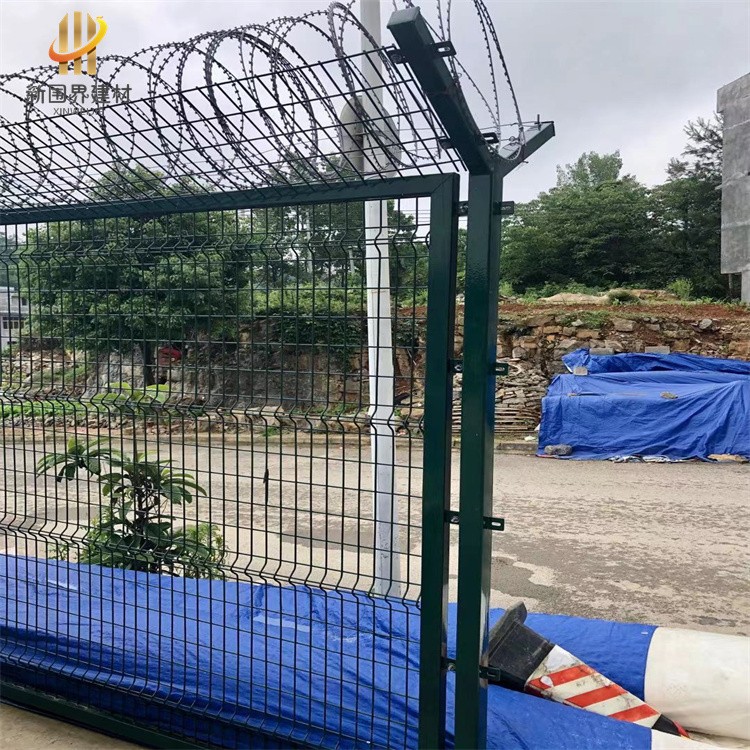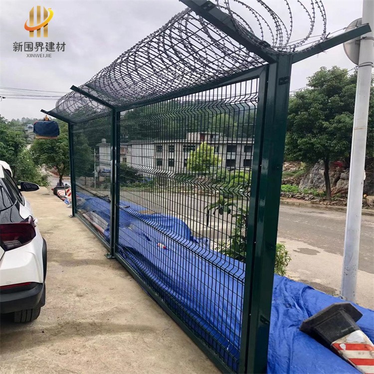 立柱:60*80mm,80*80mm,80*100mm,100*100mm等矩形鋼,或者采用70mmX100mm的掛式連接立柱。頂部焊有V型之架,用以架設蛇腹型刀刺網。產品均為熱鍍鋅后采用高質量的聚酯粉末靜電噴涂。