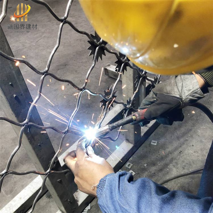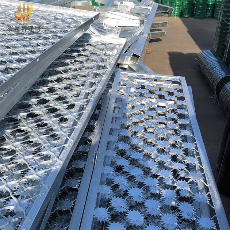 梅花刺片護欄網邊框與立柱采用螺栓固定邊耳式連接,邊耳均為50*50*5mm扁鐵,邊耳螺孔可調,調節距離不小于20mm;邊耳固定螺栓為直徑14mm*50mm全絲熱鍍鋅安全螺栓、螺母,每片網單邊連接點為8個以上。 梅花刺片護欄網整體結構堅固、具有防攀爬、抗沖擊、抗剪切特性和良好的震懾作用護欄網可平地安裝,也可在圍墻上二次安裝,有效防止攀逃。