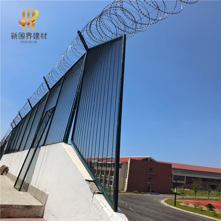 首先是由高強度的刀片刺網與高強度防護網的結合,由V型支架立拄,增強型焊接片網,安全防盜網片和刀片刺網構成。刀片刺網是一種新式防護網,由銳利尖角鍍鋅鋼板或不銹鋼薄板做刀片。