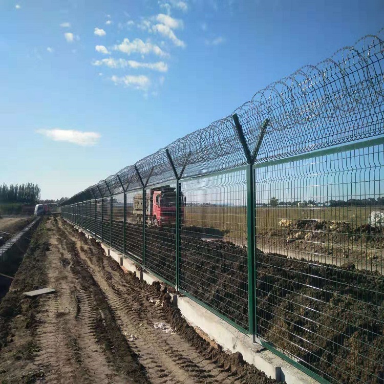 機場圍界網是一種高安全隔離防護網,這種新型隔離網一般由鋼筋焊接網、Y型防護立柱以及蛇腹式刀刺網等幾大主體組成。既有良好的通透性,又能起到強有力的安全隔離防護效果。頂部加裝刀刺網,鋒利的刀型,有效制止的攀爬行為,強有力的發揮著保護機場作用。